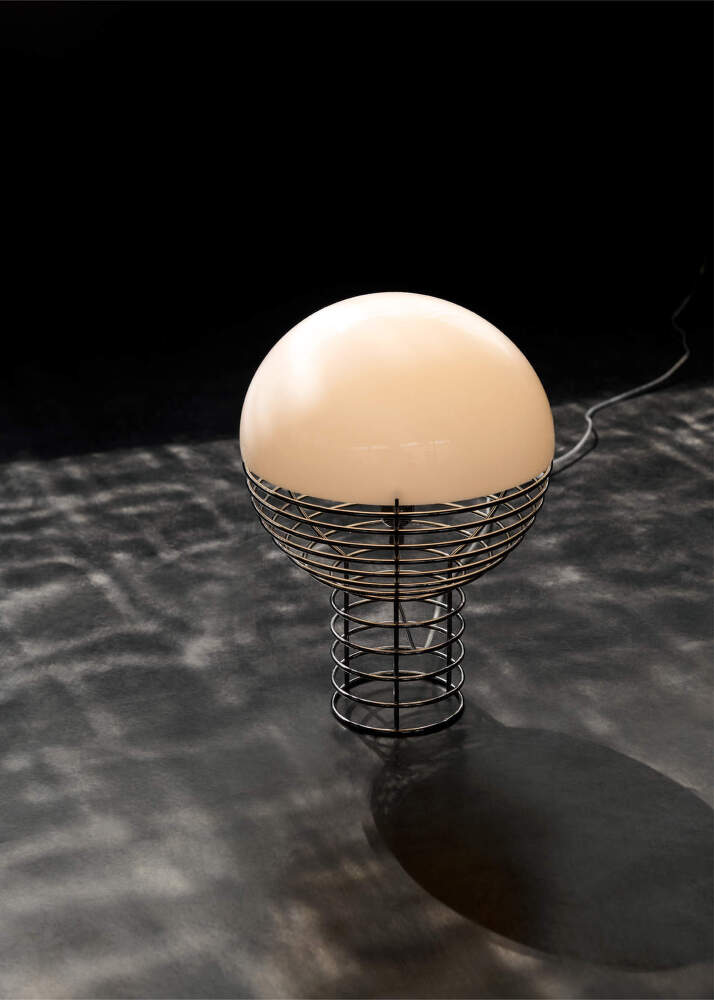 The base of the lamp consists of a series of fine concentric steel wire lines that flow seamlessly into an opal hemispherical acrylic shade. An integrated metal reflector directs the light source into the shade, ensuring soft ambient illumination without glare. The contrast between the industrial structure and the softly glowing dome is a defining feature of the entire series.